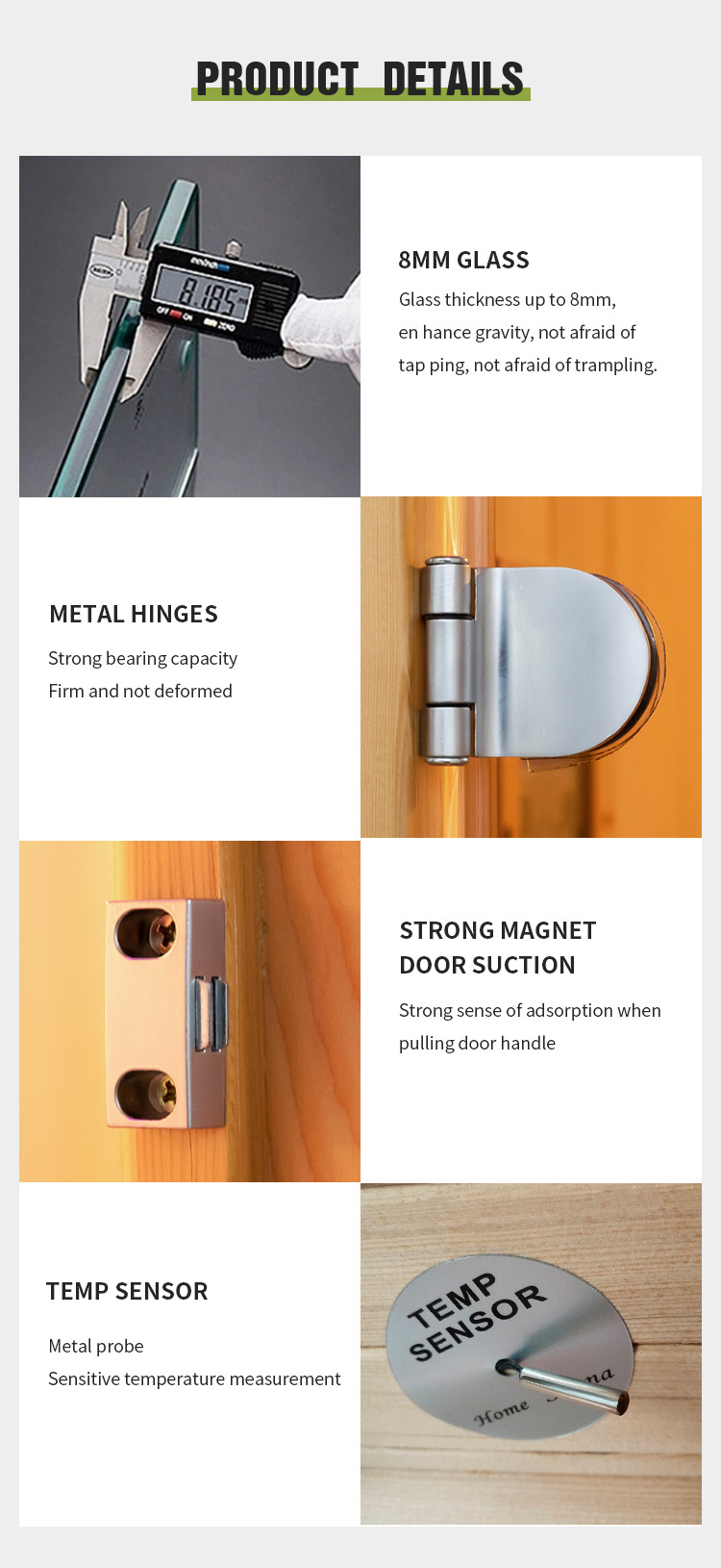 உணர்திறன் வெப்பநிலை சென்சார்: 1-3 நபர் மர அகச்சிவப்பு மற்றும் நீராவி சானா அறையில் ஒரு உலோக ஆய்வு வெப்பநிலை சென்சார் பொருத்தப்பட்டுள்ளது, இது உணர்திறன் வெப்பநிலை அளவீட்டை செயல்படுத்துகிறது. நீங்கள் எப்போதும் ஒரு வசதியான அனுபவத்திற்காக sauna வெப்பநிலையை கண்காணிக்கலாம் மற்றும் சரிசெய்யலாம்.