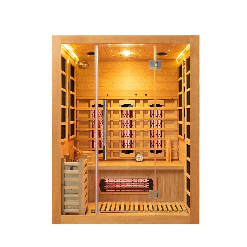 1-3 நபர் மர அகச்சிவப்பு மற்றும் நீராவி சானா அறை உங்கள் ஆரோக்கிய பயணத்தை மேம்படுத்த மேம்பட்ட அம்சங்களுடன் நிரம்பியுள்ளது: அகச்சிவப்பு ஹீட்டர்கள் மற்றும் தூர - அகச்சிவப்பு கிராபெனின் வெப்ப தகடுகள் (ஆழமான, நிதானமான வியர்வைக்கு சமமான, திறமையான வெப்பத்தை வழங்குகின்றன); ஆக்ஸிஜன் அயனிசர் (சானாவின் உள்ளே காற்றை சுத்தப்படுத்துகிறது, புதிய மற்றும் உற்சாகமான சூழ்நிலையை உருவாக்குகிறது); லைட் & ஸ்பீக்கரைப் படித்தல் (உங்கள் சானா அமர்வை அனுபவிக்கும் போது இசையைப் படிக்க அல்லது கேட்க உங்களை அனுமதிக்கிறது); கண்ட்ரோல் பேனல் (தனிப்படுத்தப்பட்ட அனுபவத்திற்காக வெப்பநிலை, நேரம் மற்றும் பிற அமைப்புகளை எளிதாக சரிசெய்வதை செயல்படுத்துகிறது); சௌனா ஸ்டவ் & லைட் வேவ் டியூப் (நீராவி மற்றும் அகச்சிவப்பு வெப்பத்தை உருவாக்க ஒன்றாக வேலை செய்யுங்கள், நீராவி மற்றும் தூர அகச்சிவப்பு சானா பிரியர்களுக்கு உணவளிக்கிறது).