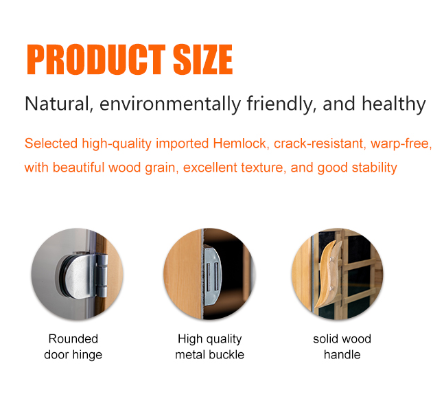 ஃபின்னிஷ் இறக்குமதி செய்யப்பட்ட சானா மரம் போன்ற சிறந்த சுற்றுச்சூழல் நட்பு பொருட்களை நாங்கள் பயன்படுத்துகிறோம், இது நீடித்த மற்றும் அரிப்பை எதிர்க்கும், ஆனால் வெப்பத்தின் போது இயற்கை மர வாசனையை வெளியிடுகிறது, இது சுவாச மண்டலத்தின் ஆரோக்கியத்திற்கு நன்மை பயக்கும். அதே நேரத்தில், மேம்பட்ட வெப்பநிலை கட்டுப்பாடு மற்றும் ஈரப்பதமூட்டும் அமைப்புகள் வீட்டு சானா அறையில் வெப்பநிலை மற்றும் ஈரப்பதம் மனித ஓய்வுக்கு மிகவும் பொருத்தமான நிலையில் பராமரிக்கப்படுகின்றன என்பதை உறுதிப்படுத்துகின்றன, இது பாரம்பரிய saunas கொண்டு வரக்கூடிய வறட்சி மற்றும் அசௌகரியத்தை தவிர்க்கிறது. ஆனால் sauna அனுபவத்தின் பாதுகாப்பு மற்றும் வசதியை பெரிதும் மேம்படுத்துகிறது.