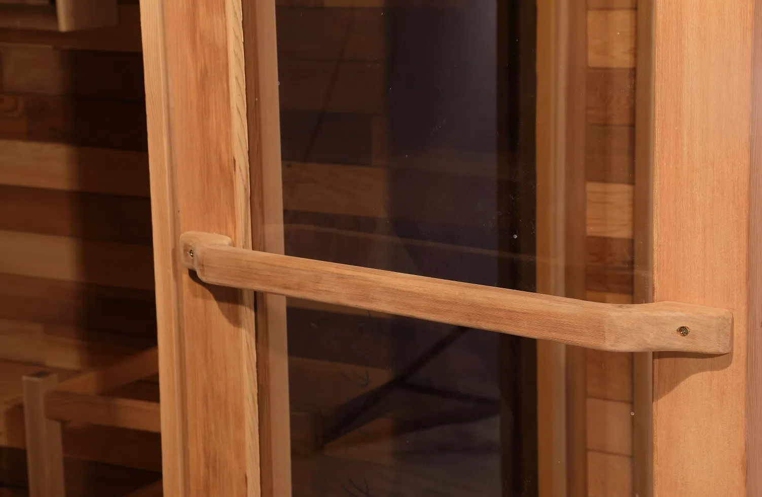 உயர்தர இயற்கை ஹேம்லாக் மரத்தில் இருந்து வடிவமைக்கப்பட்டது, தொடுவதற்கு வசதியாக உணரக்கூடிய நுட்பமான இயற்கை மர நறுமணத்துடன் மென்மையான மற்றும் சூடான தானியங்களைக் கொண்டுள்ளது. இந்த பொருள் தொழில்முறை அரிப்பு எதிர்ப்பு சிகிச்சைக்கு உட்படுகிறது, சீரான அடர்த்தி மற்றும் சிதைவு மற்றும் விரிசல் எதிர்ப்பை பெருமைப்படுத்துகிறது. உள் முற்றத்தில் நேரடி சூரிய ஒளி அல்லது முற்றத்தில் ஈரப்பதமான சூழ்நிலையில் வெளிப்பட்டாலும், இது நீண்ட கால பயன்பாட்டிற்கான நிலையான அமைப்பைப் பராமரிக்கிறது, உங்கள் வெளிப்புற sauna அமர்வுகளுக்கு அமைதியான காடுகளால் ஈர்க்கப்பட்ட சூழ்நிலையை உருவாக்க, நடைமுறை நீடித்துழைப்புடன் இயற்கை அழகியலை இணைக்கிறது.