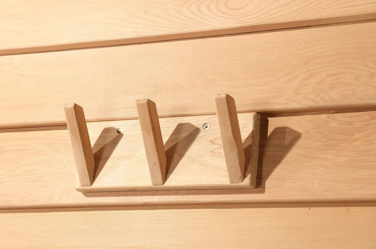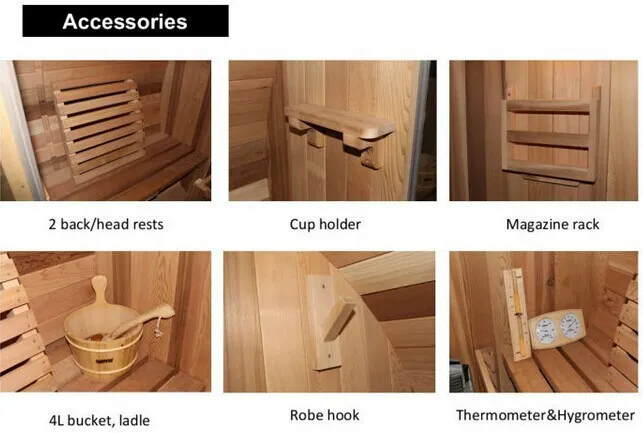 - வசதியான பாகங்கள்: கோப்பை வைத்திருப்பவர், பத்திரிகை ரேக், உள்ளமைக்கப்பட்ட துணி தொங்கும் (துணிகள் மற்றும் துண்டுகளை சாதாரணமாக சேமிப்பதற்காக, sauna அமர்வுகளின் போது ஒழுங்கீனத்தை நீக்குகிறது);