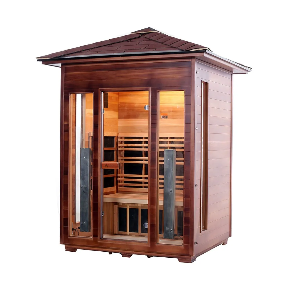 இந்த வெளிப்புற sauna கனடாவின் மேற்கத்திய சிவப்பு சிடார் அல்லது கனடிய ஹெம்லாக் ஆகியவற்றிலிருந்து வடிவமைக்கப்பட்டுள்ளது. மரம் அரிப்பு மற்றும் ஈரப்பதம் எதிர்ப்பு மற்றும் கட்டமைப்பு ஸ்திரத்தன்மை ஆகியவற்றைக் கொண்டுள்ளது. தொலைதூர அகச்சிவப்பு கார்பன் ஃபைபர் வெப்பமாக்கல் தொழில்நுட்பத்துடன் பொருத்தப்பட்டுள்ளது, இது விரைவாக வெப்பமடைகிறது மற்றும் வெப்பத்தை சமமாக விநியோகிக்கிறது. முற்றங்கள், பால்கனிகள், வில்லா தோட்டங்கள், குளக்கரை பகுதிகள் மற்றும் ஓய்வு விடுதிகள் போன்ற வெளிப்புற சூழல்களுக்கு ஏற்றது.